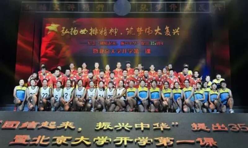 2016年9月5日下午,在里约奥运会上夺得冠军的中国女子排球队来到北京大学参加纪念“团结起来,振兴中华”提出35周年活动暨北京大学开学第一课。