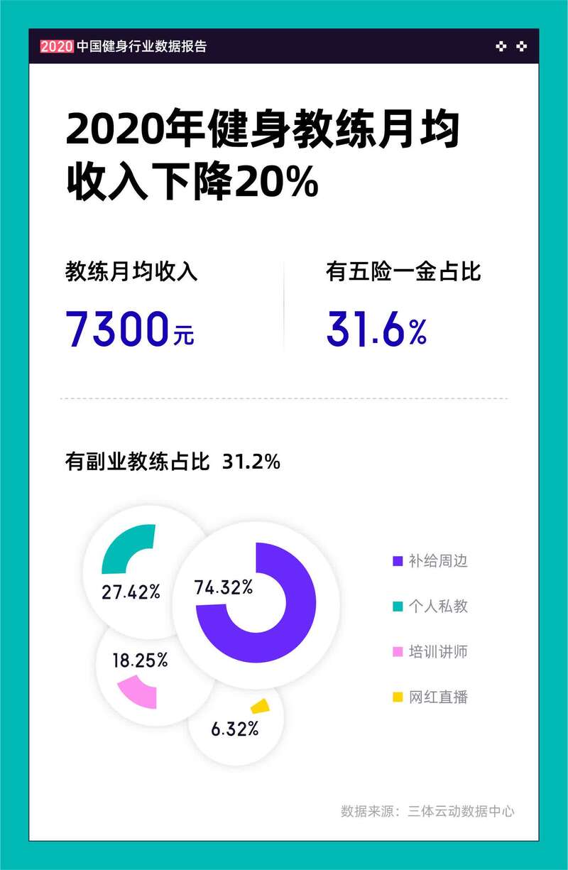 根据全国健身场馆和店均教练人数的推算和统计,截至2020年12月份,中国健身教练从业人数约为90万,其中健身俱乐部教练61.2万,工作室教练28.8万。受疫情影响,2020年教练的月均收入为7300元左右,相较去年降幅达到20%,主要原因是疫情严重时几乎完全没有收入。