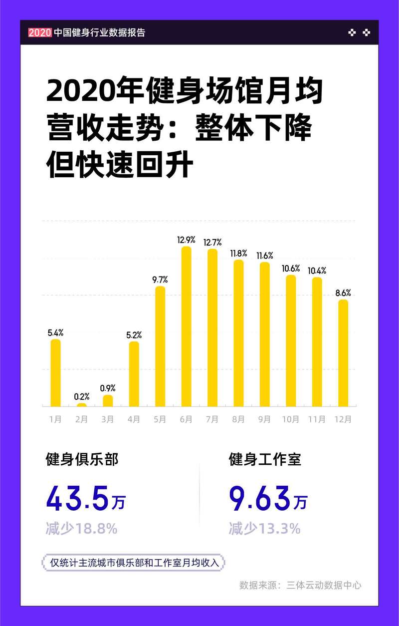 《报告》显示,2020年3月份开始,大部分地区包括健身房在内的线下门店在政策指导下陆续有序恢复营业,至4-5月份各地健身场馆恢复全面复工状态,全国健身产业逐渐复苏,曲线开始爬坡上扬,6月份,全国健身房整体营收达到全年最高值。