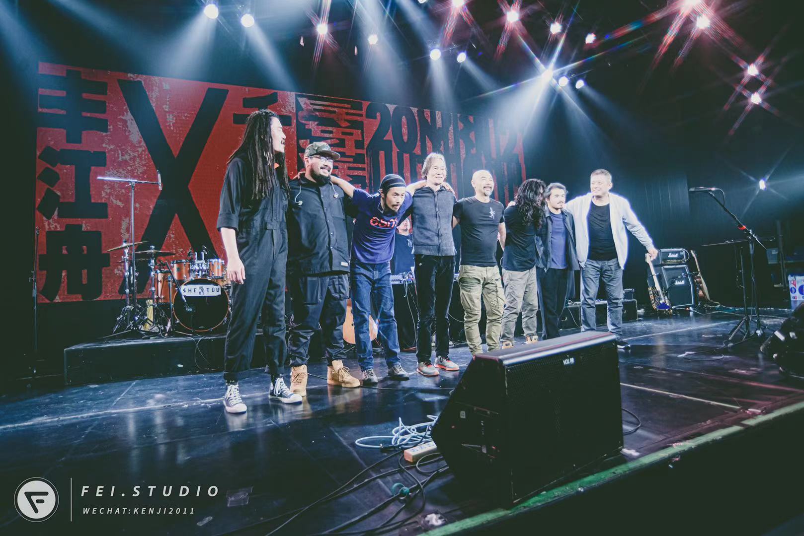 左起:贝司手小飞、鼓手胡子、主唱吴吞、嘉宾丰江舟、键盘手郭大刚、吉他手大江、唢呐手子枫、嘉宾孙孟晋