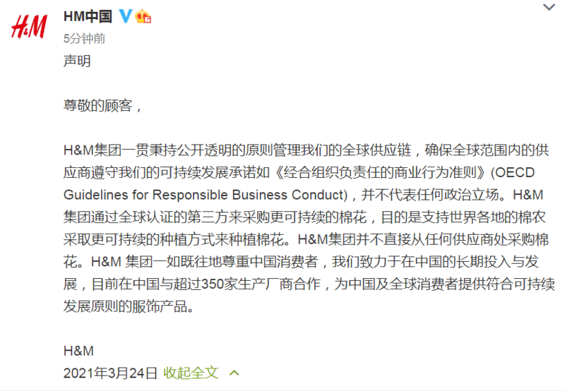 声明称,H&M集团通过全球认证的第三方来采购更可持续的棉花,目的是支持世界各地的棉农采取更可持续的种植方式来种植棉花。H&M集团并不直接从任何供应商处采购棉花。另外,H&M表示,关于全球供应链管理部分,集团一贯秉持公开透明的原则,并不代表任何政治立场。