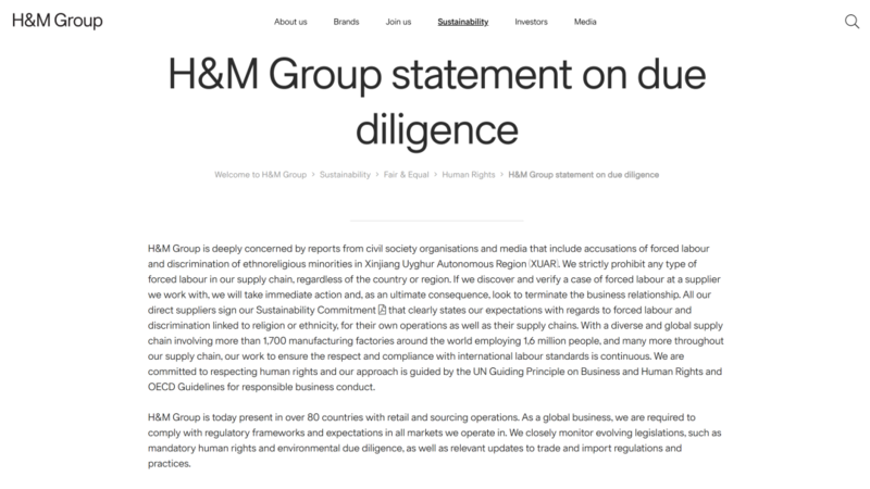 H&M的这份声明写道:H&M集团对来自民间社会组织的报告和媒体的报道深表关注,其中包括对新疆维吾尔自治区少数民族强迫劳动和宗教歧视的指控。