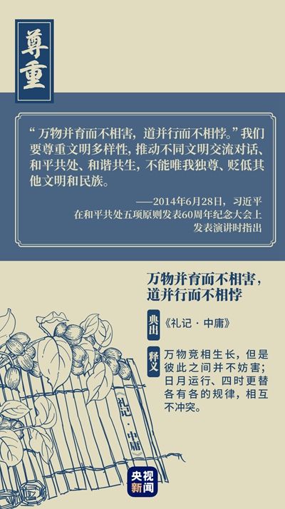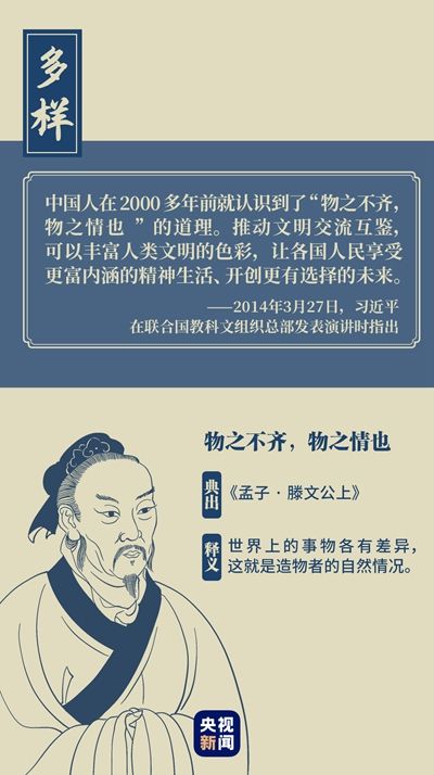 “我们应该推动不同文明相互尊重、和谐共处,让文明交流互鉴成为增进各国人民友谊的桥梁、推动人类社会进步的动力、维护世界和平的纽带。”