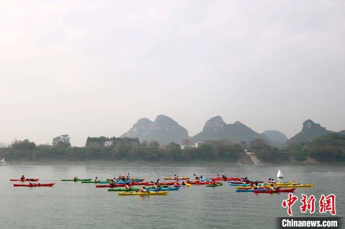 中新网来宾3月28日电 (陈秋霞)3月28日,2021年皮划艇马拉松公开赛(武宣站)在广西来宾市武宣县黔江水域开赛。来自中国内地和澳门的111名参赛选手在宛如水墨画的珠江水系黔江河段展开激烈角逐,吸引当地民众近距离观赏皮划艇运动之美。
