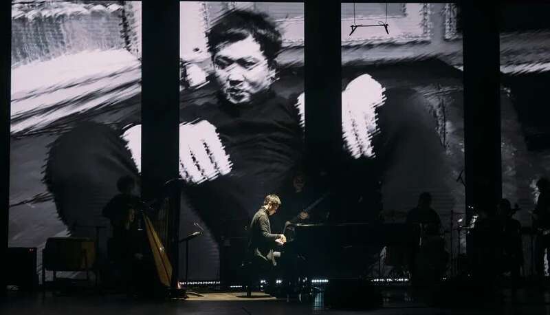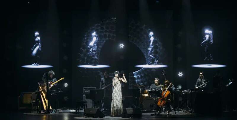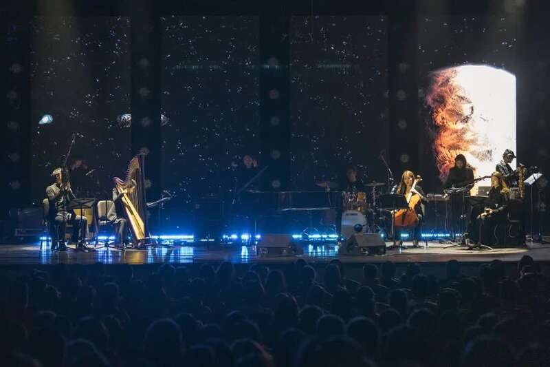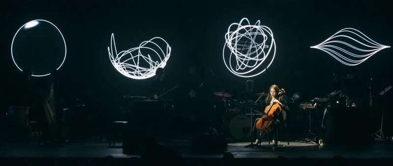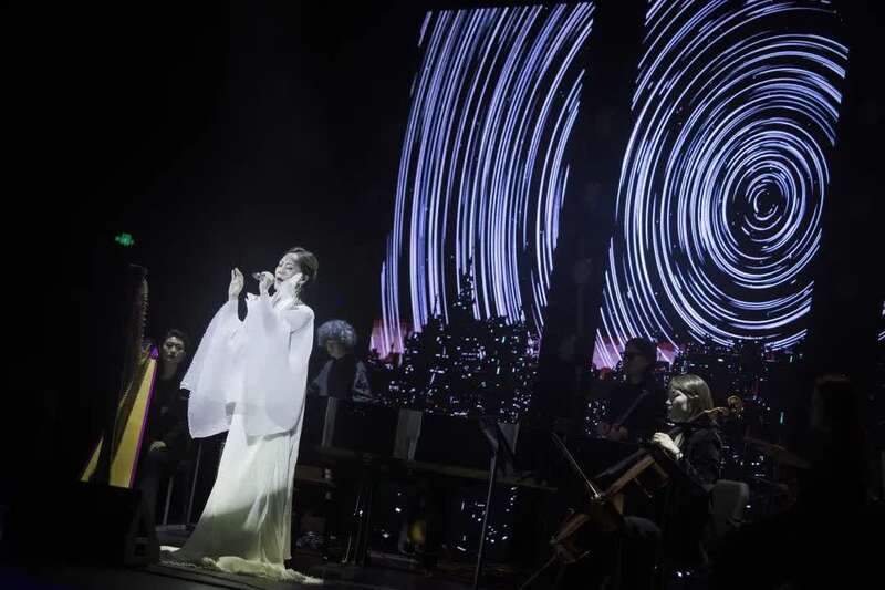 一首《荒寂》拉开了音乐会的序幕,配合视觉的流动,艺术家们将观众带到了20万年前的宇宙。转瞬间,时间来到约公元前1600年—约公元前1046年,歌者小草唱起了《商颂》,而视觉上的时针正在逆向倒转……
