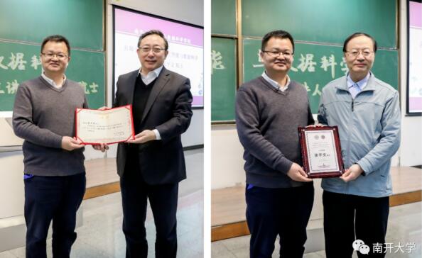 曹雪涛院士向张平文院士致送“南开大学通识教育课程特聘教师”聘书,马志明院士向张平文院士致送“南开大学名师引领通识课‘走进人工智能与数据科学’主讲教师”纪念牌。