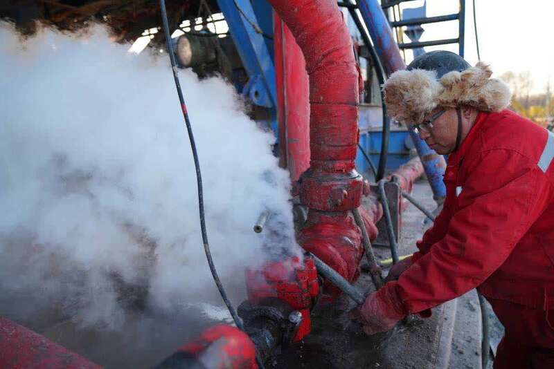 ▲ 2020年12月28日,大庆油田1205钻井队泥浆工程师王波在钻井队井场里作业。