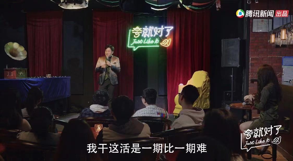 跟《吐槽大会5》的录影棚相比,《夸就对了》在制作上明显就“穷”多了。节目的录制现场,很像线下的脱口秀,场所很小,台上大概可以容纳两三个人,旁边有个小吧台,嘉宾表演时,主持人尉迟琳嘉和严尚嘉就坐在吧台旁,台下也就坐了10余名观众。