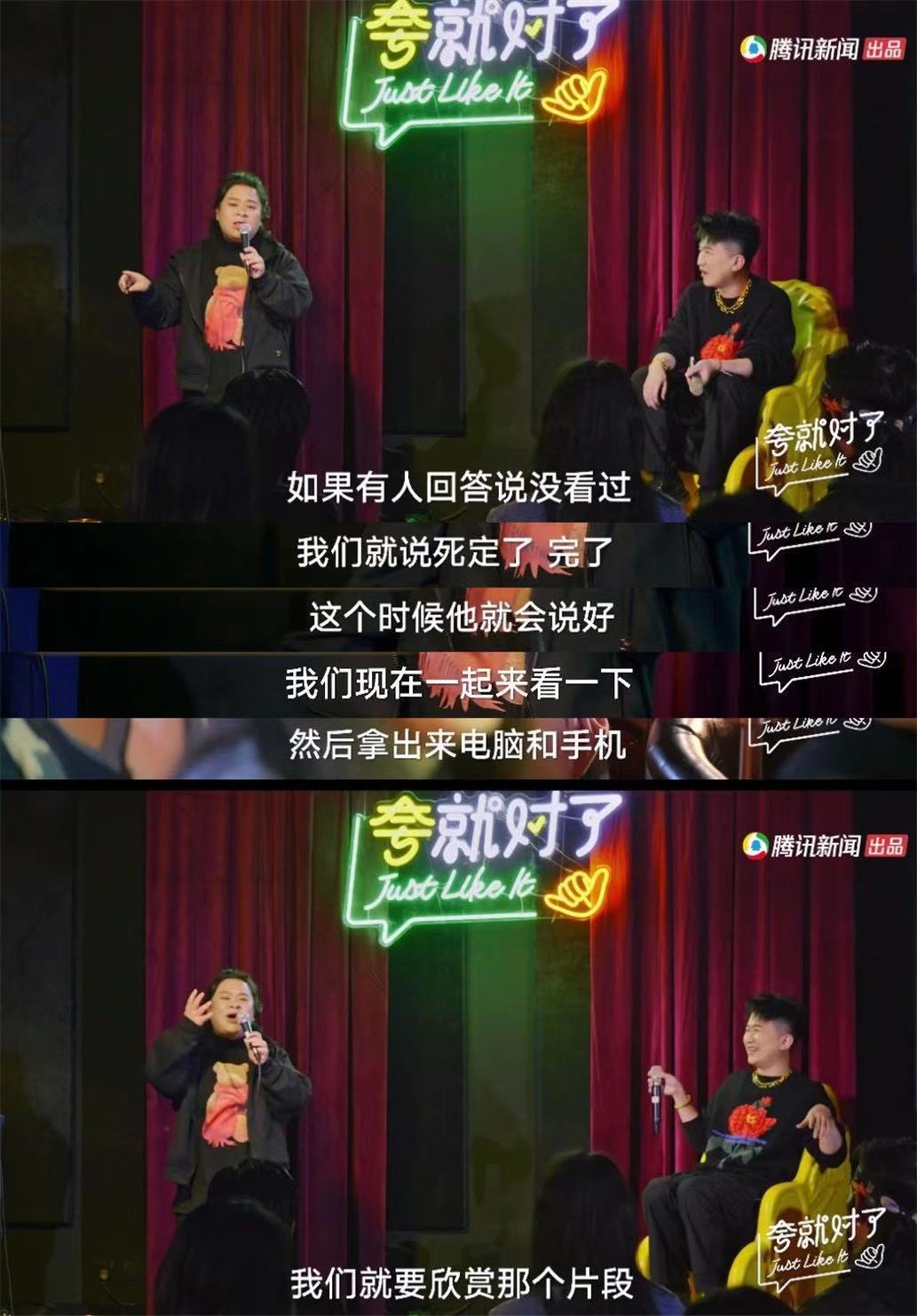 《夸就对了》还有一个很特别的设计。《吐槽大会》都是以一个完成的脱口秀表演为段落的,但《夸就对了》在表演途中会适时地插入一些以纪录片手法拍摄的访谈,以辅助/论证表演者所说的内容。更确切地说,《夸就对了》是一档带有访谈和记录元素的脱口秀节目。