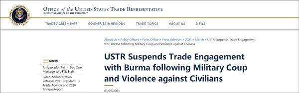 美国贸易代表办公室:暂停美国与缅甸的所有贸易往来