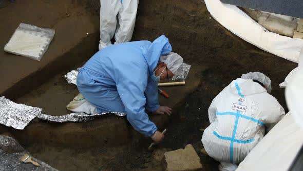 北京大学考古文博学院博士 8号坑负责人 蔡宁:一块一块地清理,最后全部揭露出来之后,我们整个地再进行三维扫描,然后再进行绘图,把这个遗物的分布状况完全搞清楚之后,我们再整体地提取。