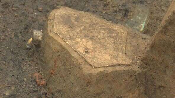 8号坑最新暴露出来的青铜碎片,主要集中在坑的南部,而坑的中部,目前以红烧土快、石板等建筑构件居多,专家介绍,这种布局,反映出当时古蜀人有意识的一种填埋行为。