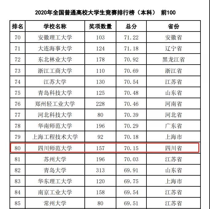 近日,中国高等教育学会高校竞赛评估与管理体系研究工作组发布了2020全国普通高校大学生竞赛排行榜。我校进入2020年全国普通高校大学生竞赛排行榜(本科)前100,位列2020年当年排名第80位,较2019年排名上升105位,位居四川省高校第5位,全国师范院校第4位;位列2016-2020年全国普通高校大学生竞赛五年排行榜(本科)220位,较首轮五年(2012-2016年)榜单上升101位。充分展示了我校近年来以学科竞赛为抓手,促进创新人才培养方面取得的成效。