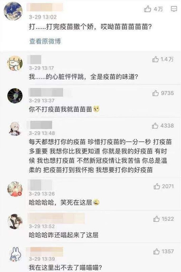 3月29日,“我们一起打疫苗,一起苗苗苗苗苗”火速刷屏,冲上热搜↓↓↓