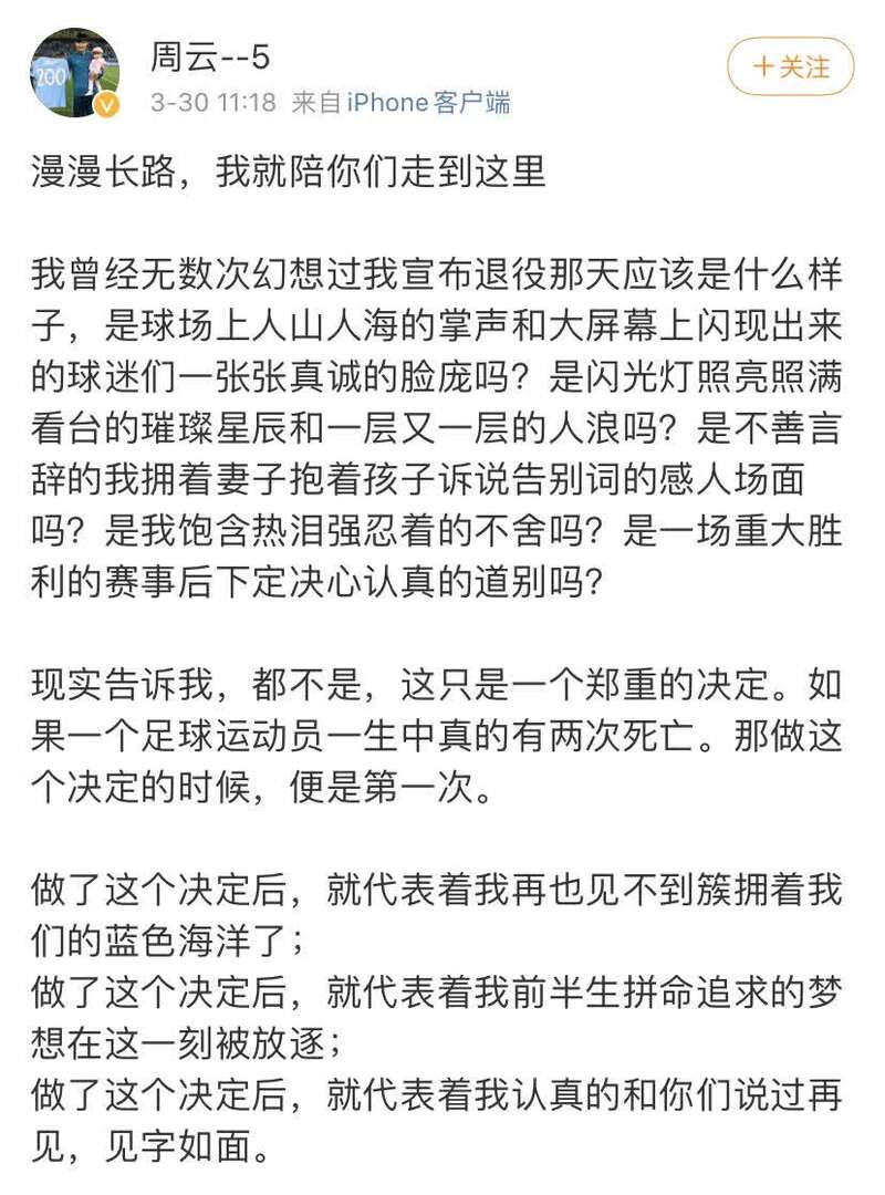 30日他在个人社交媒体上发长文告别:“如果一个足球运动员一生中真的有两次死亡,那做这个决定的时候,便是第一次。漫漫长路,我就陪你们走到这里。”