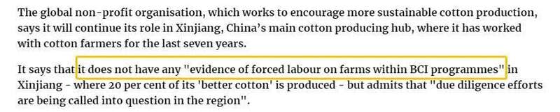 ▲报道称,“BCI表示,在新疆没有发现任何‘BCI项目内农场有强迫劳动的证据’。”