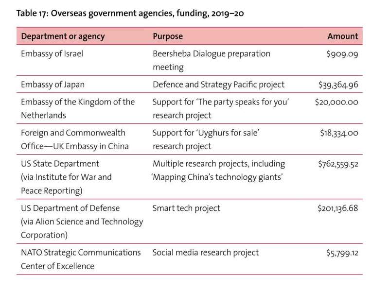 尽管ASPI声称自己是一个“独立的”“无党派”的研究机构,但谭主从一份披露其2019—2020财年资金来源的文件中,找到了一些破绽。
