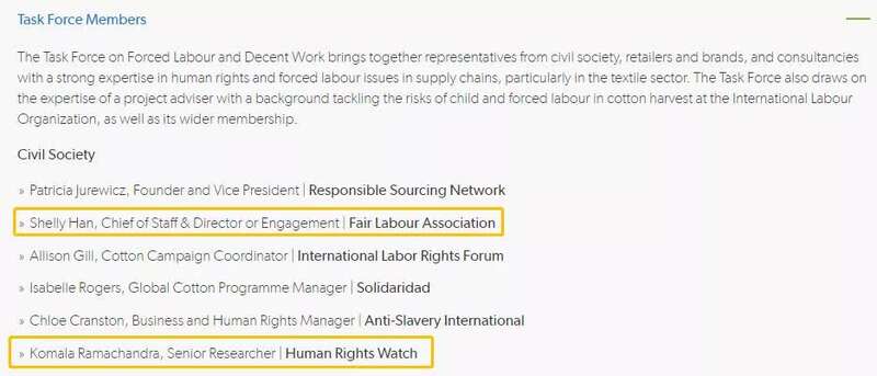 注意这两个人,美国公平劳工协会秘书长兼董事韩雪莉和“人权观察”高级研究员科马拉·拉马尚德拉。