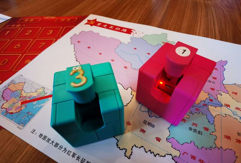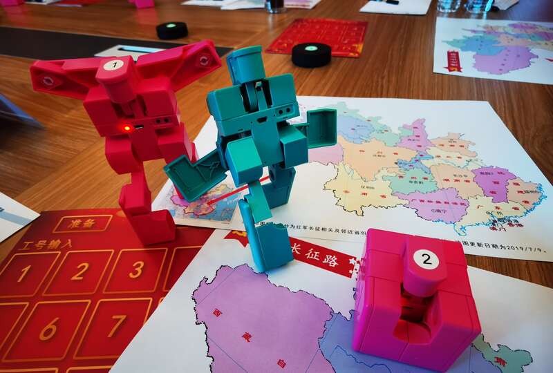 学习过程中,系统能够在团队集体学习环境下,为学习者每人随机抽取24个题目,进行党史知识学习、测试、竞赛,总分100分。学习者利用手持“机器人方块”智能终端,通过自主在题卡上进行选题、答题、抢答等操作环节,营造出生动立体的学习环境和比学赶帮超的学习氛围。全部答题结束后,大屏幕自动显示10位学习者答题得分信息,并为获得前三名人员颁发电子奖牌。