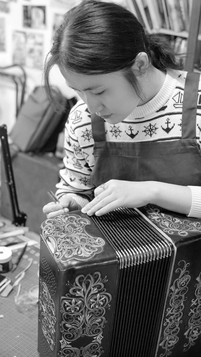 从2019年开始,孟璐璐将每件作品的制作过程拍成视频放在网上展示,很多网友被她的作品吸引,开始找她定制皮雕艺术品,“找我定制皮雕画、卡包、文创产品的人比较多,迄今为止最贵的定制作品是一把刀鞘,卖了1.6万元。”