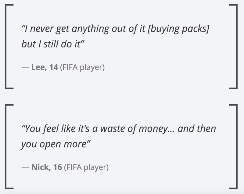 2019年10月,英格兰儿童委员会(The Children’s Commissioner for England)发布了对谈10至16岁未成年人的报告,通过对谈了解游戏对他们的影响。报告专门有一节为《Gaming and Gambling》(游戏与赌博),报告显示,儿童在游戏上的支出金额逐年增加,游戏的设计也鼓励消费,比如战利品箱。“这就像赌博一样,你花了钱,可能得不到好东西,也可能获得特别好的。”16岁的FIFA玩家Tim说。