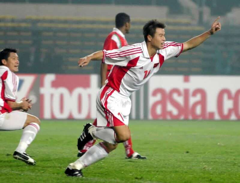 2001年10月7日,中国队队员于根伟(右)攻入一球后欢呼。新华社记者戚恒摄(数码传真照片)