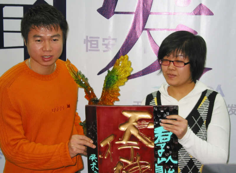 2006年1月27日,球迷向于根伟(左)赠送纪念品。当日,于根伟正式退役。新华社记者曾志坚摄