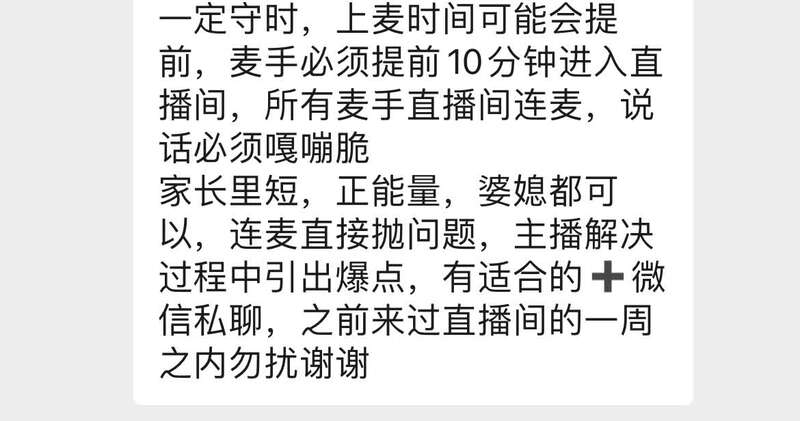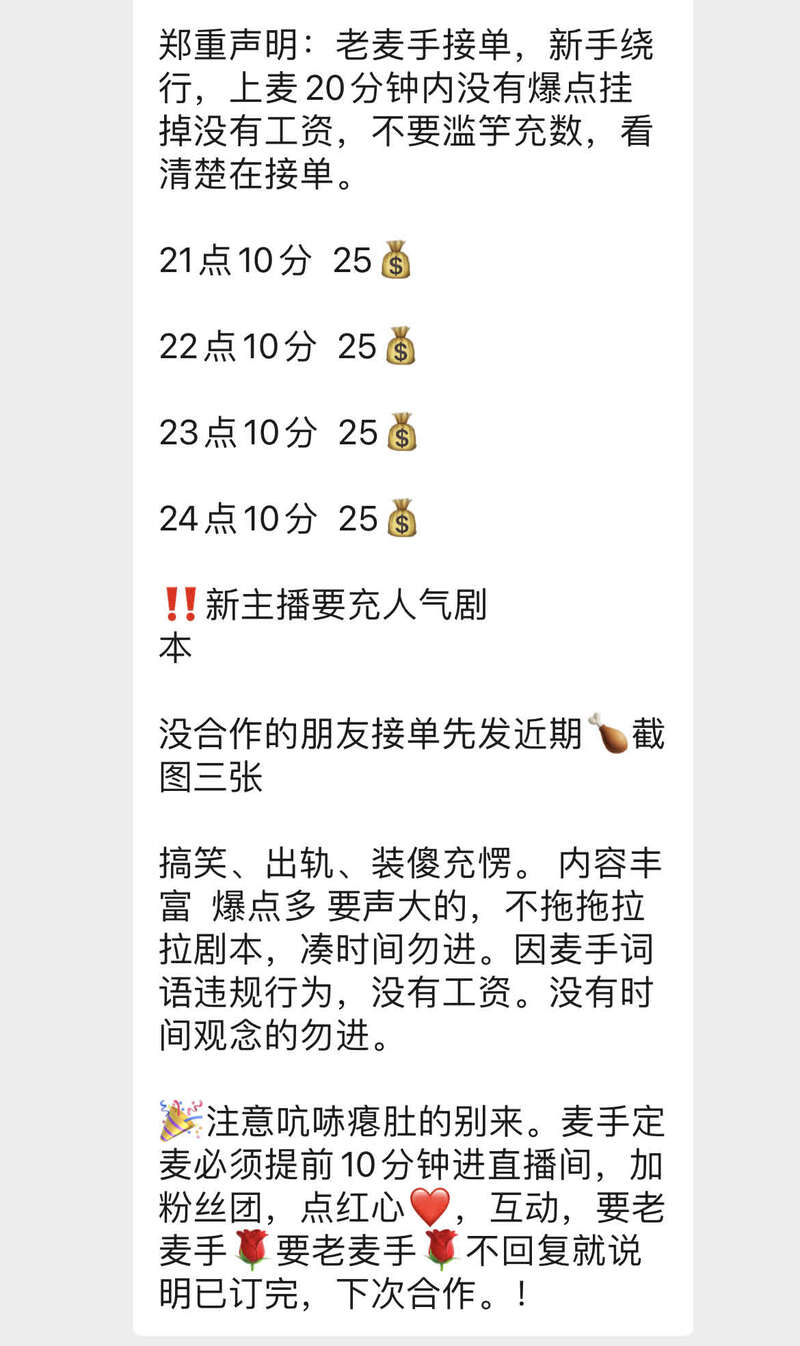中新网记者发现,网上有不少情感主播与麦手沟通的群,还有供麦手接单的小程序。招麦手的信息一般会说明时间、价格,通常还要求口音、经验、内容等。通常情况下,有丰富经验的老麦手较受欢迎。据上述业内人士介绍,达成初步合作意向后,主播会先审核剧本大纲。直播前,主播还会联系麦手对戏,大概走一遍直播流程,以免出意外。如果是互怼的戏或者是出轨激情的戏,还要商量好尺度,免得影响直播效果或被封号。