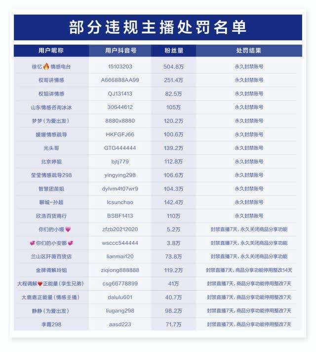 针对此种现象,抖音安全中心3月份曾发布公告,对卖惨带货、编造离奇故事、演戏炒作等行为进行违规处罚。近30天内,抖音平台共处理相关违规直播间446个,封禁违规账号33个,包含“权哥讲情感”“光头哥”等10个粉丝超百万主播,另有“金牌调解玲姐”等多位主播被封禁直播权限。