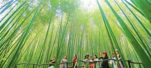 游客在山东省沂南县铜井镇竹泉村竹林栈道畅游,尽享春日美景。 王彦冰摄