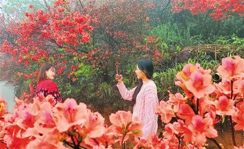 湖南省常宁市天堂山杜鹃花竞相绽放,吸引众多游人前来游玩,感受惬意的春日气息。周秀鱼春摄