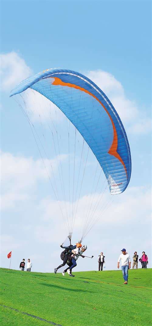 游人在重庆市北碚区天府镇体验滑翔乐趣。近年来,北碚区致力于打造“处处是风景、全城可休闲”的旅游休闲度假目的地。