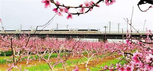 河南省宁陵县柳河镇桃源关村,一列动车从桃花丛中疾驰而过。近年来,宁陵县因地制宜着力打造“旅游经济”,助力农民增收。吕忠箱摄