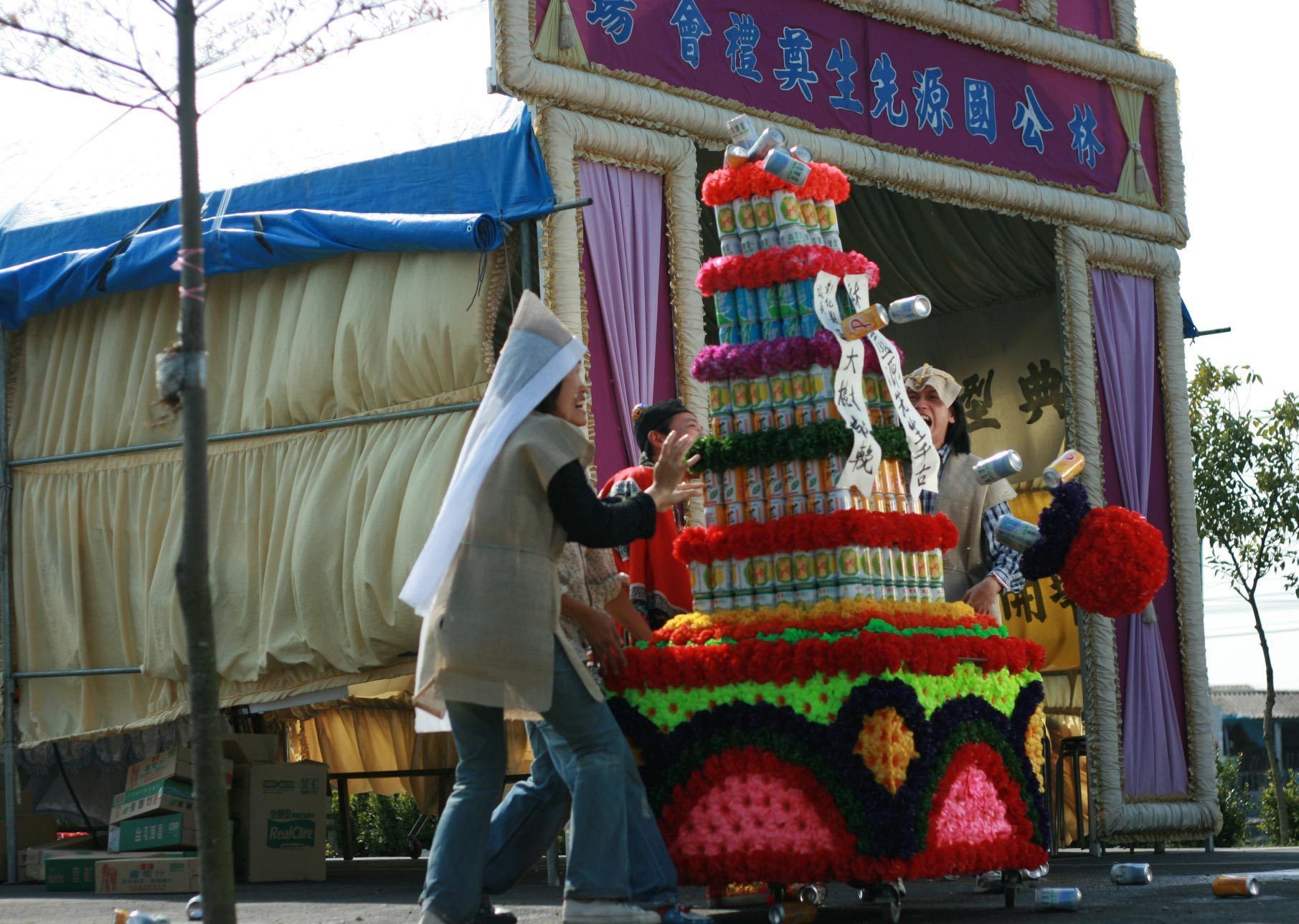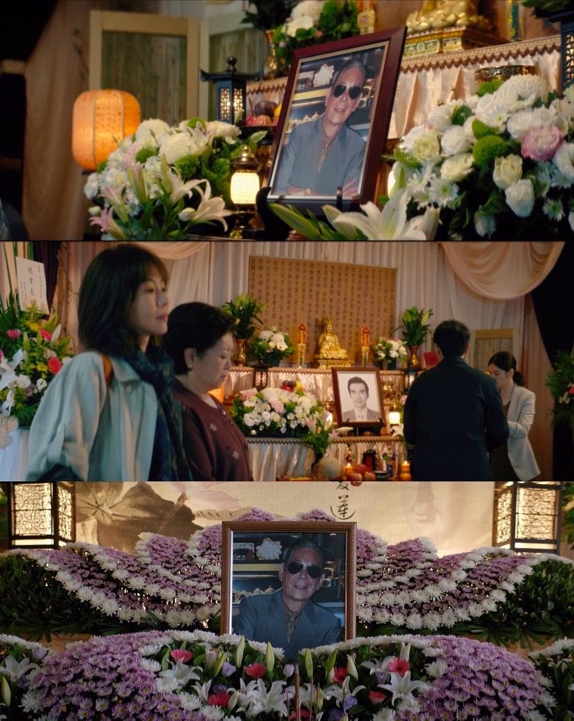 亦是由于父亲生前性情开朗,阿梅准备灵堂所用遗像时,会拿出他在自己的摊位前开心唱K的照片。她希望父亲在另一个世界,也能终日开开心心。不过亲友看来,这张毫不庄重的照片必须更换。最终,照片背景由街市换成山水,父亲手中的麦克风也变成了白百合。