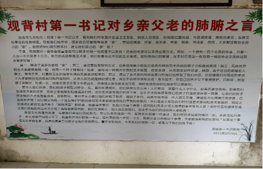 陈湘书记的信中说道,“观背文化部落的改造,需要我们全体村民的努力。可以负责任地说一句,观背文化部落一旦建成,我们村的环境绝对焕然一新。”“毫不夸张地说,今天我们说做的一切,都是为了我们的孩子啊!”这些感染肺腑的话语,打动了村民、激励了村民,从斤斤计较利益、互相计较扯皮转变为培养大局观念、积极支持改造,建成乡村振兴的示范村和群众生活的富裕村。后来,接任观背村书记的郑国雄同志继续努力,与“手留余香”志愿服务队等发动村民参加志愿组织、参与志愿服务,提供新时代文明实践系列活动,为村庄带来更多的生机活力、民俗魅力。
