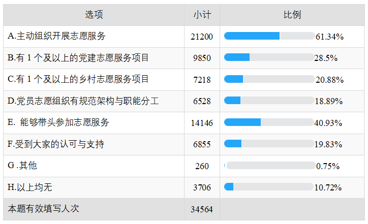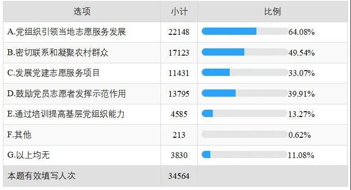 新时代的各项工作都要坚持党的领导,发挥党建引领的作用。在乡村振兴志愿服务中,党组织的引领作用和党员的示范作用都非常重要。从调查的数据看,志愿者认为农村基层党组织关注和重视志愿服务,提供推动和支持,就能够激发广大群众参与志愿服务的热情,为乡村振兴提供生机活力,为扶贫助困提供积极力量。从调查数据看,志愿者了解并认同“党组织引领当地志愿服务发展”的占64.08%,“鼓励党员志愿者发挥示范带动作用”的占39.91%。