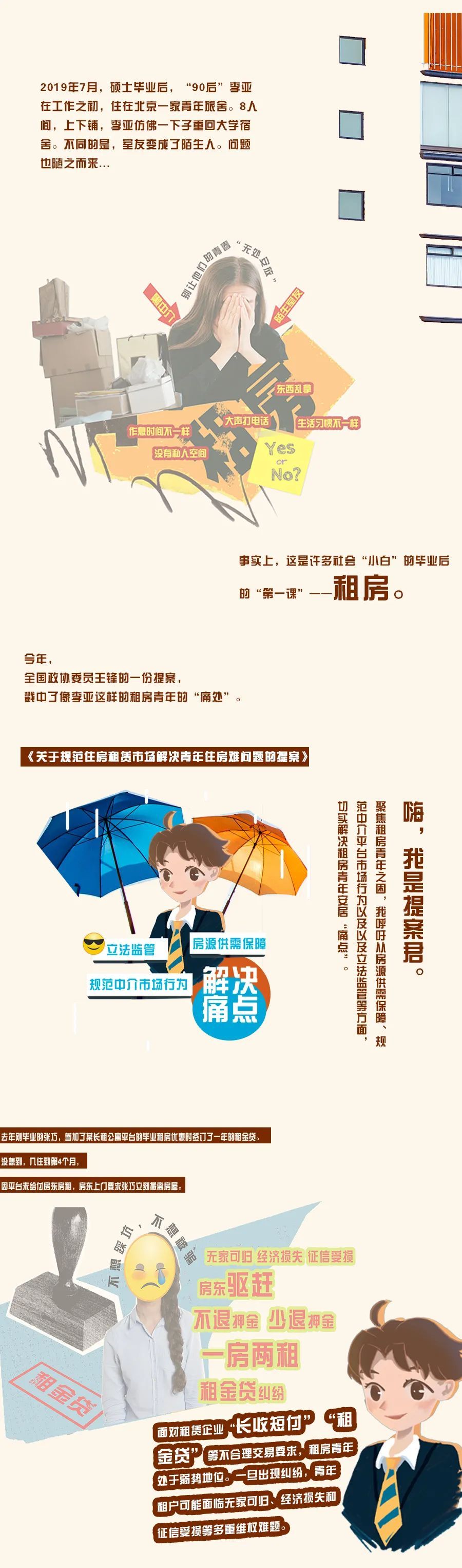 房东不退或少退押金,“黑中介”一房二租,陷入“租金贷”纠纷……你在租房之路上都踩过哪些“坑”呢?今年两会,全国政协委员王锋的一份提案就聚焦广大租房青年之“痛”~