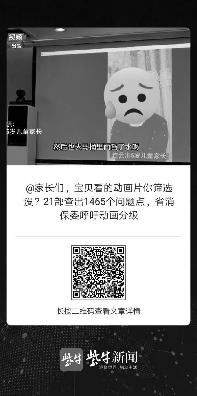 5岁儿童看了动画片中的马桶饮料,也拿杯子在自家马桶舀水喝;暴力、犯罪元素,在动画片中有涉及……昨日,江苏省消保委发布《动画领域侵害未成年人成长安全消费调查报告》(以下简称《报告》)。《报告》显示,21部动画片共梳理出1465个问题点;8成家长支持进一步严格把控放映尺度。江苏省消保委呼吁出台动画分级制度,下一步将依法约谈涉及的动画经营相关方;对拒不整改的企业,将考虑通过公益诉讼等手段坚决维护未成年人合法权益。 通讯员 徐悦 扬子晚报/紫牛新闻记者 马燕