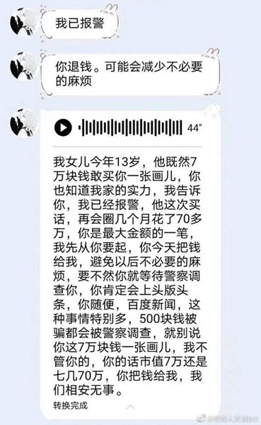 芙芙的妈妈语音表示,芙芙在绘圈几个月花了70多万,白琴是金额最大的一笔,所以先从白琴要起,白琴把钱退给她,以减少不必要的麻烦。“要不然你就等待警察查你,500块钱被骗都会被警察调查,就别说你这7万块钱一张画。你把钱给我,我们相安无事。”