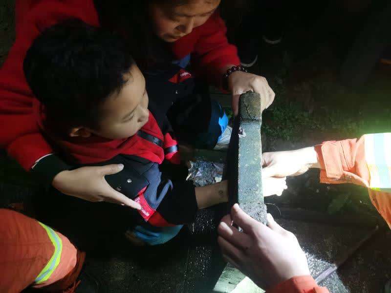 救援过程中,为了防止破拆钳的振动影响小男孩身体平衡造成被卡手臂骨折,同时,避免飞溅的水泥渣伤及小男孩头部,消防员胡旭蹲下身子,把自己的安全帽摘下戴在小男孩的头上,护住小男孩,不停安慰他。