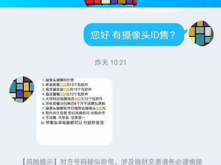 简单咨询后,这名客服人员列出“价目表”。其中,包括168元、238元的“家庭套餐”以及收费更高的“酒店套餐”和大学附近酒店,破解摄像头ID数量在12个至15个之间。当记者询问是否用某App(可公开下载的网络监控系统)进行绑定观看时,对方表示,现在不能用了,需换成另一款远程监控系统。