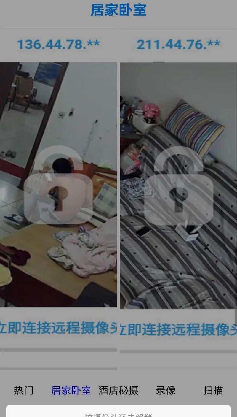 这些破解ID是否真能对公民隐私实时监控?在客服人员展示的某App中,包括大量未解锁的隐私摄像头监控截图,他表示,通过付费绑定后,客户就可以在手机端观看。这些摄像头大部分对准的是卧室或客厅,部分清晰度较高。记者注意到,该App上还有大量通过其他渠道充值注册的人员。