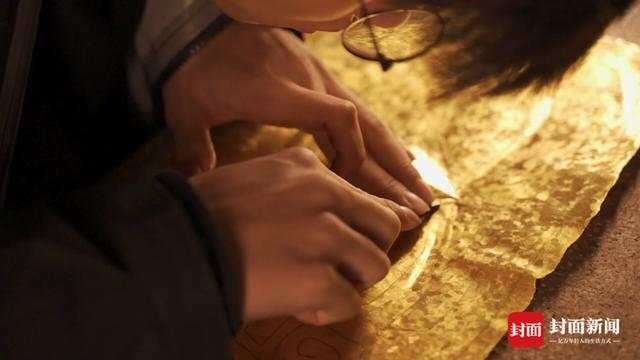 “他应用了锻打、镂空、抛光等工艺,这些工艺的制作流程与金面具的制作流程基本是差不多的。”朱亚蓉告诉封面新闻记者,但在工具的使用上,他用到了剪刀、铁锤、喷灯,在三星堆时期是没有的。才浅花了15天时间,在三星堆时期,会花更长的时间来制作金面具。