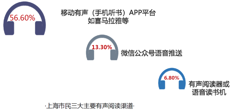 市民进行有声阅读的主要渠道为移动有声(手机听书)APP 平台,占比为56.60%,微信公众号语音推送成为市民进行有声阅读的第二选择, 占比为13.30%。其次为有声阅读器或语音读书机,占比为6.8%。