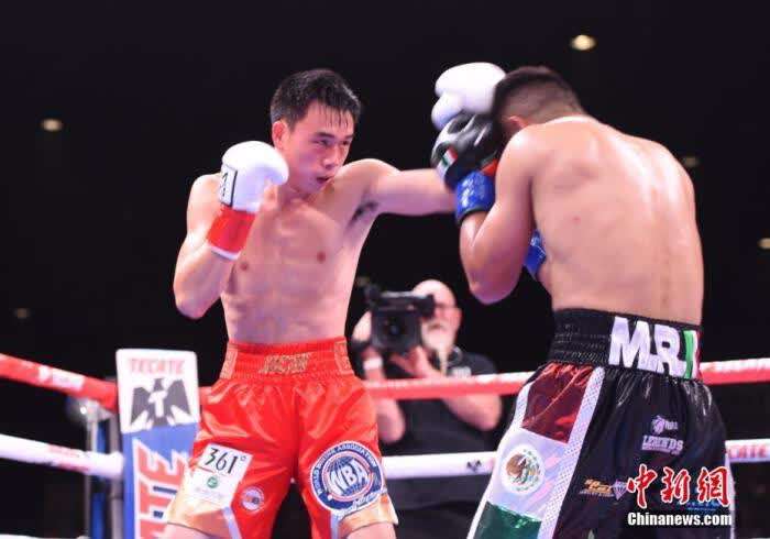 当地时间2019年11月23日晚,美国加州印第奥市,中国M23战队拳手、WBA羽量级世界拳王徐灿(左)客场击败美国挑战者罗伯斯,打赢其第二次世界拳王卫冕战,成功捍卫中国目前唯一的世界拳王金腰带。 中新社记者 张朔 摄