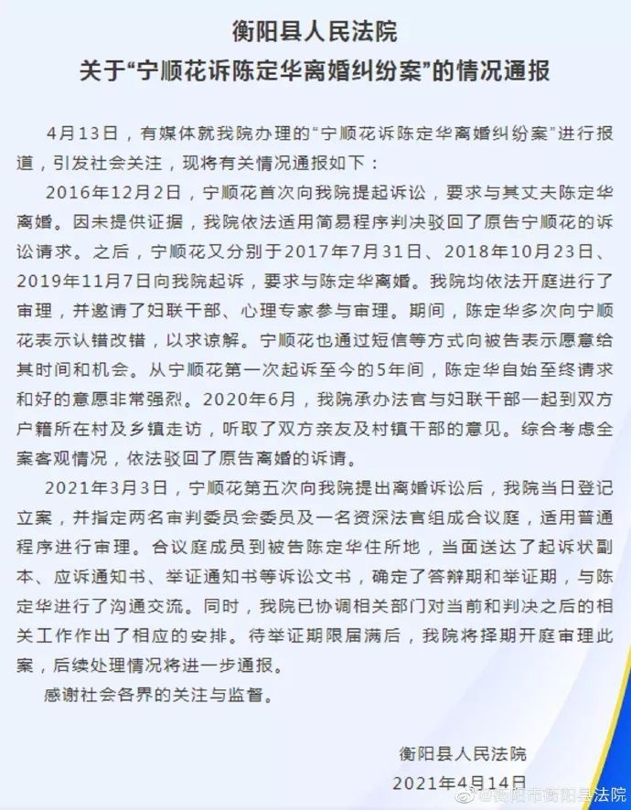衡阳市衡阳县人民法院15日通过官方微博发布关于“宁顺花诉陈定华离婚纠纷案”的情况通报称,从宁顺花第一次起诉至今的5年间,其丈夫陈定华自始至终请求和好的意愿非常强烈。2021年3月3日,宁顺花第五次向该院提出离婚诉讼后,该院当日登记立案。待举证期限届满后,将择期开庭审理此案。