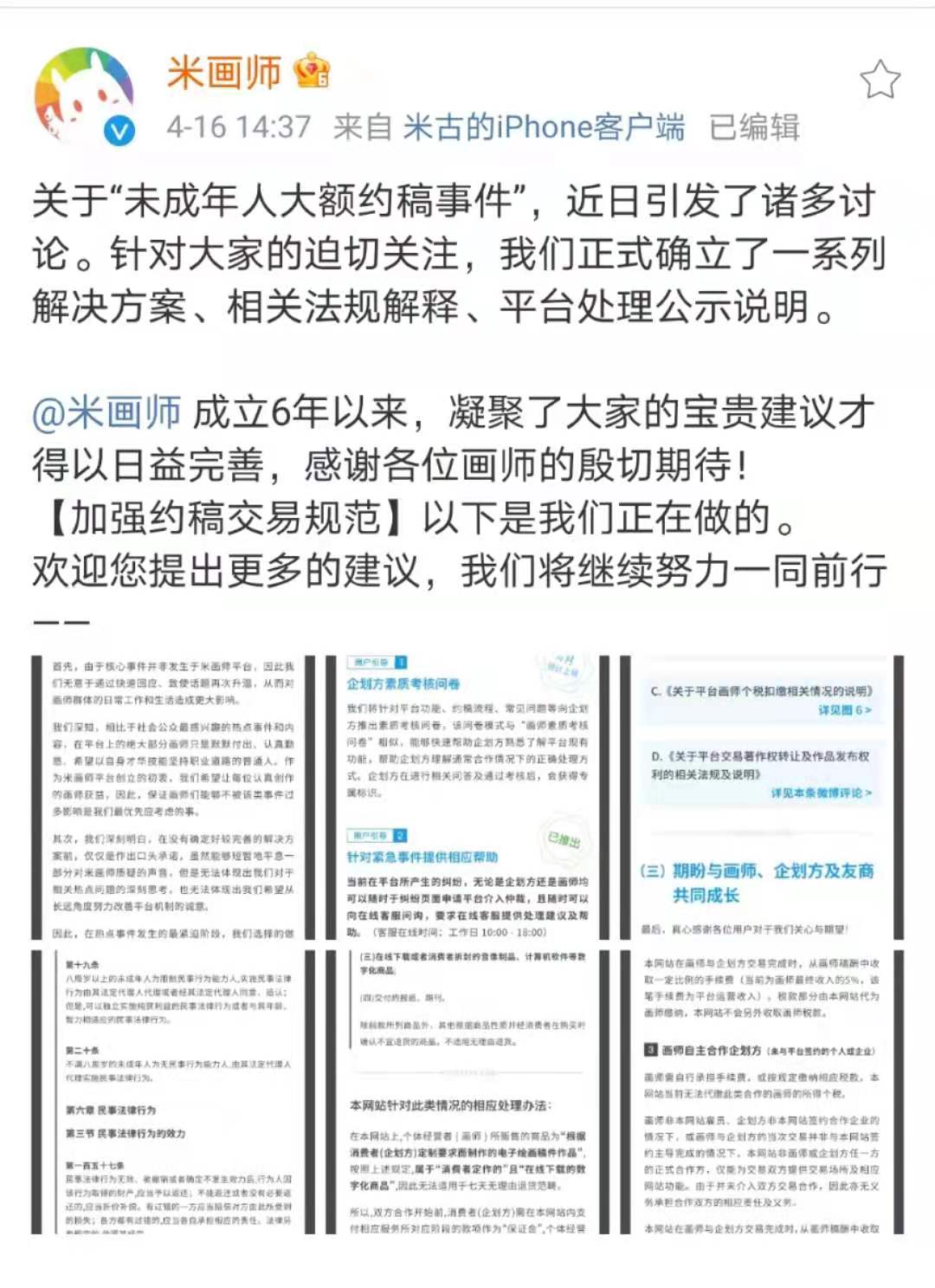 米画师平台针对“未成年人大额约稿事件”发布回应。图片来源:微博“米画师”