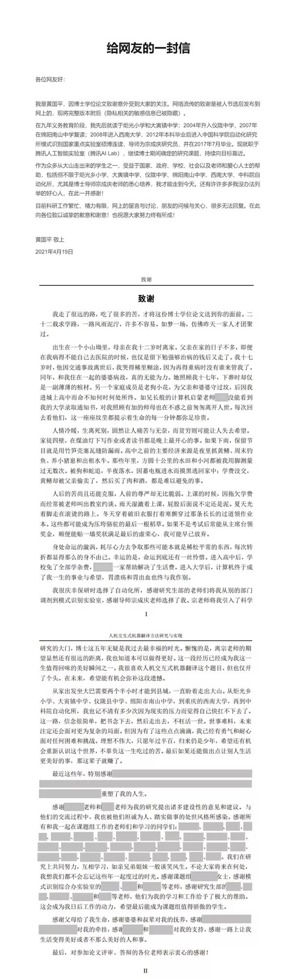 该论文作者黄国平今日通过深圳商报&读创发文,讲述自己成长经历,并向网友和朋友的关心表示歉意和谢意。他在文中称,网络流传的致谢是被人节选后发布到网上的,现将完整版本附后(隐私相关的敏感信息已被隐藏)。在黄国文附上的致谢完整版本中,已将相关人员姓名隐去。