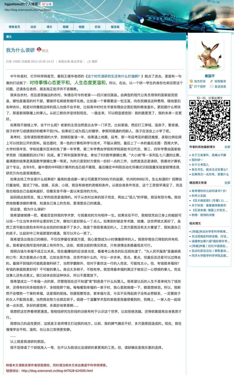 澎湃新闻(www.thepaper.cn)注意到,黄国平早年在科学网开设的博客中,曾撰文记载了自己本科毕业、攻读研究生这几年的经历和心路历程。其中,一篇发表于2012年10月、题为《我为什么读研》的文章在其博客中被精选。