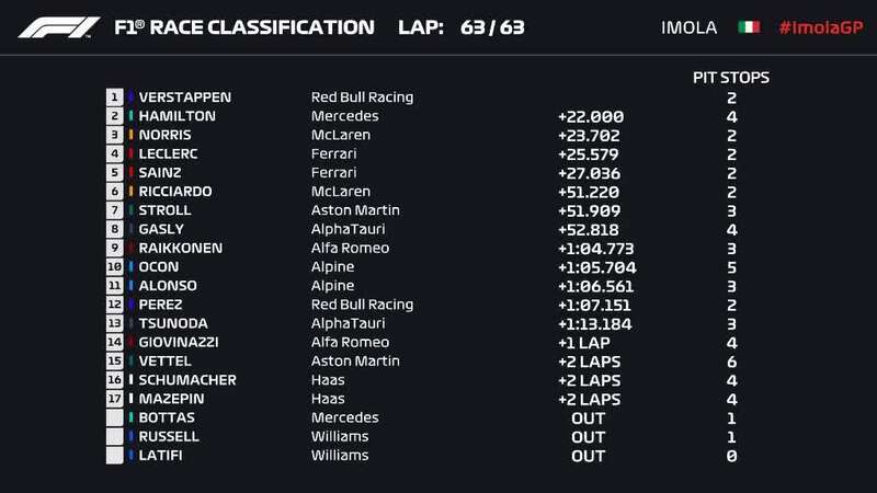 最终,维斯塔潘顺利以第一名冲线,夺得本赛季首个分站冠军,汉密尔顿收获亚军,诺里斯第三登上领奖台。两位法拉利车手勒克莱尔和塞恩斯分列第四和第五;第六到第十分别是:里卡多、斯托尔、加斯利、莱科宁、奥康。